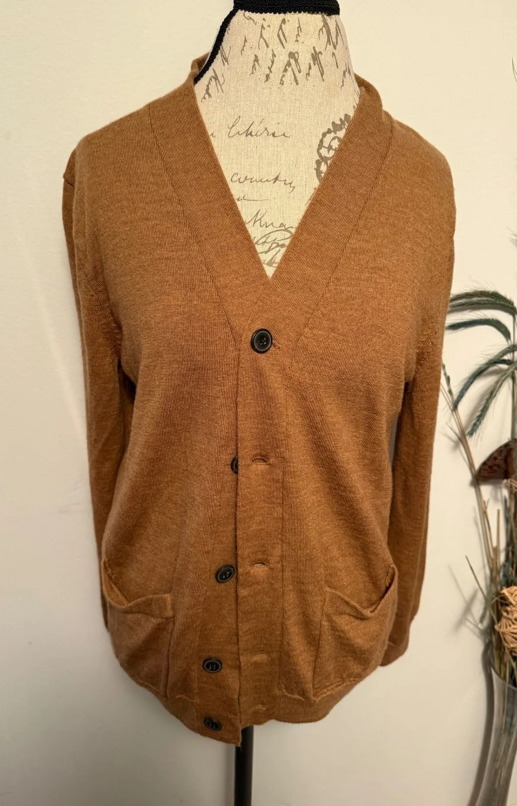 J Crew Merino Wool slim fit cardigan sweater in a rich brown hue. This versatile knit features a classic V-neckline, button-front closure, and two convenient front pockets. Perfect for layering over a t-shirt or dress shirt for a smart casual look or for adding a touch of warmth to your everyday ensemble. Style: Cardigan Department: Women Material: Wool, Merino Wool Neckline: V-Neck Sleeve Length: Long Sleeve Type: Sweater Features: Pockets, Lightweight Pattern: Solid Fabric Type: Knit Accents: Button Knit Style: Tight-Knit Season: Spring, Fall Fit: Slim Occasion: Casual, Workwear Unit Type: Unit Keywords: J Crew, merino wool, cardigan, sweater, slim fit, brown, v-neck, button front, menswear inspired, classic, layering, smart casual, fall fashion, winter wardrobe
