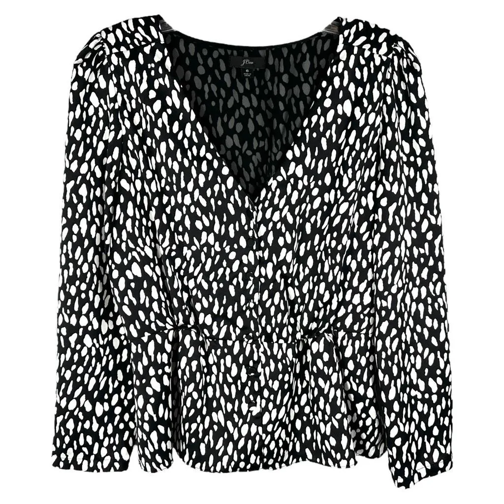 J Crew Size 6 Top Long Sleeve Crepe Satin Peplum Top Black White V Neck 1376 Chest: 20” across Length: 22” Polyester Very good, pre-owned condition! Smoke-free, pet-free home. Ships within 1 to 2 business days. Save the planet. Shop second hand.