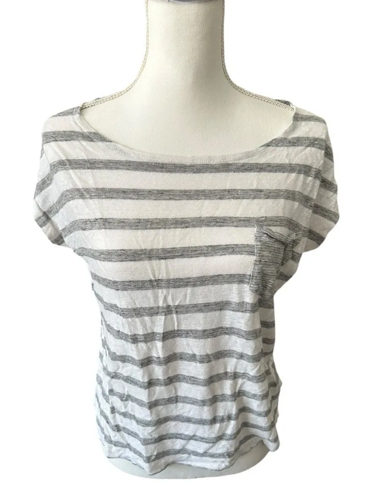 A J Crew women's short sleeve t-shirt with a classic horizontal stripe pattern. This top features a relaxed fit, a comfortable scoop neckline, and a single chest pocket. The breathable linen fabric makes it ideal for warm weather. Perfect for casual outings, weekend errands, or a relaxed beach day. Type: T-Shirt Department: Women Style: Basic Material: 100% Linen Neckline: Scoop Neck Sleeve Length: Short Sleeve Sleeve Type: Dolman Sleeve Pattern: Striped Accents: Pocket Features: Lightweight Fit: Relaxed Fabric Type: Knit Occasion: Casual Closure: Pullover Season: Spring, Summer Unit Type: Unit Keywords: J Crew, linen, striped, tee, t shirt, womens, casual, summer, breathable, scoop neck, short sleeve, pocket tee, lightweight, basic