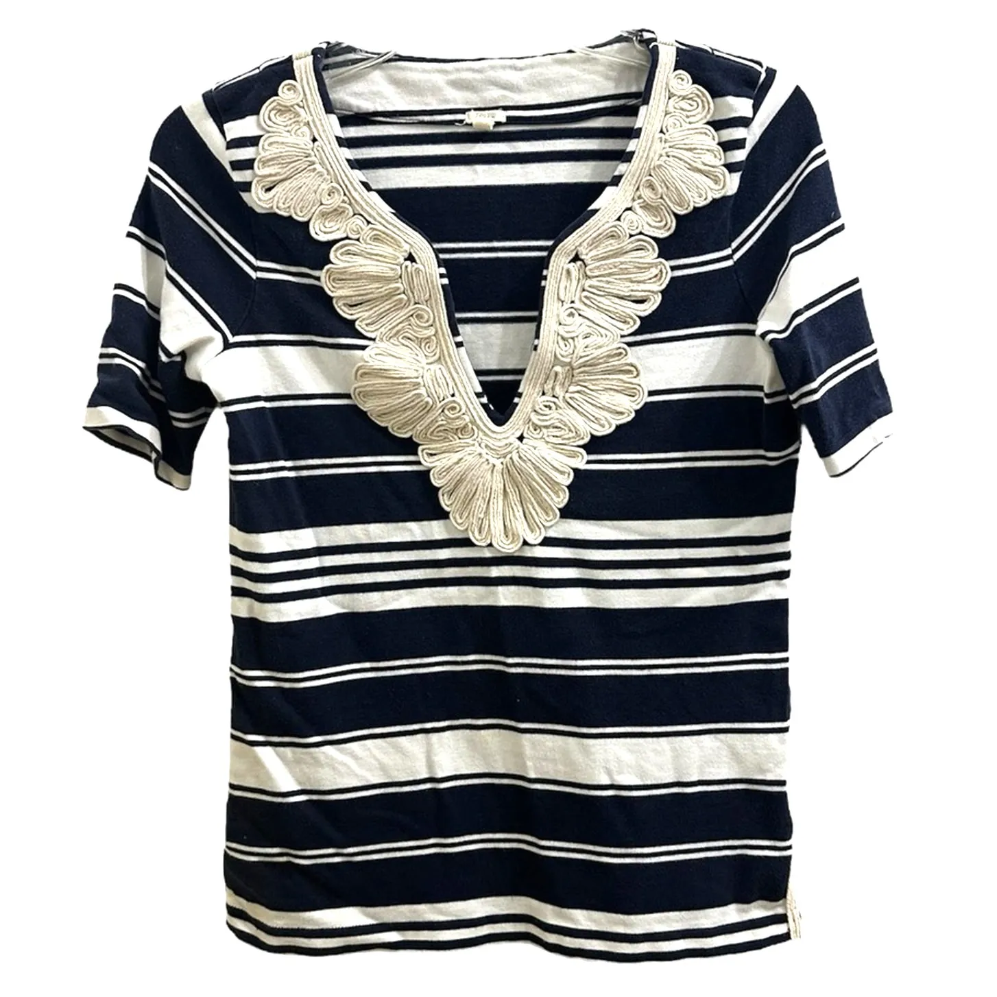 J. Crew brand top. Tunic style. Navy and white horizontal stripes in varying thickness. Half sleeves. V-neckline with a wide decoration of swirled rope. Split sides with rope accent. Very nautical, yacht club, old money, preppy look. Thicker material of 70% cotton and 30% rayon. Machine wash gentle. Good used condition. Has one subtle stain on stomach and smaller but darker one on back of shoulder. See closeups. Size XS. Measures 17” pit to pit.