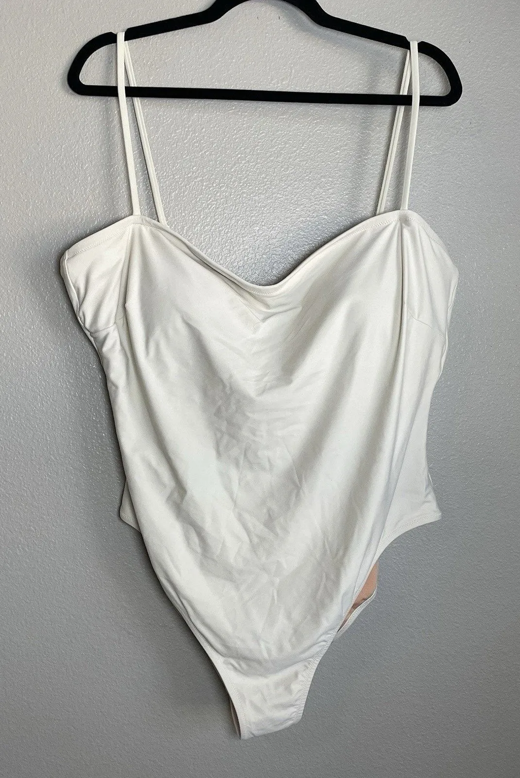The J Crew Women's One Piece Swimsuit in size 20 features a square neck and a flattering cheeky swim bottom style. The ivory color and solid pattern make it a classic choice for a day at the beach or pool. With spaghetti straps, padded cups, and stretch fabric, this swimsuit offers both style and comfort for a fun summer look. Made from machine washable material and designed by J.Crew, this plus-size swimsuit is a versatile and stylish addition to any woman's wardrobe.