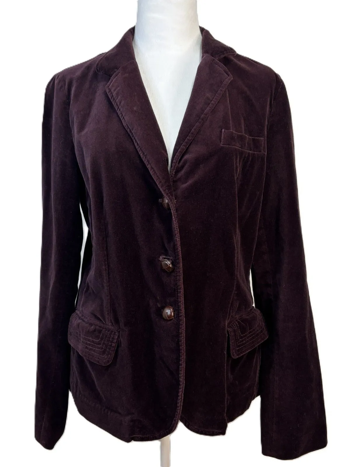 Brand: J Crew Size: Medium Color: eggplant, Plum, dark purple, Sleeve length: long Features: velvet, 3 wooden buttons with an additional button on the collar. Can be worn open as a traditional lapel or buttoned up for a stand collar. 4 wooden buttons on the sleeves. 1 chest pocket. 2 front pockets with flaps. Style: velvet blazer Occasion: special occasion, evening event, dinner date, wedding guest, business event, office, teacher, Theme: academia, preppy, career,