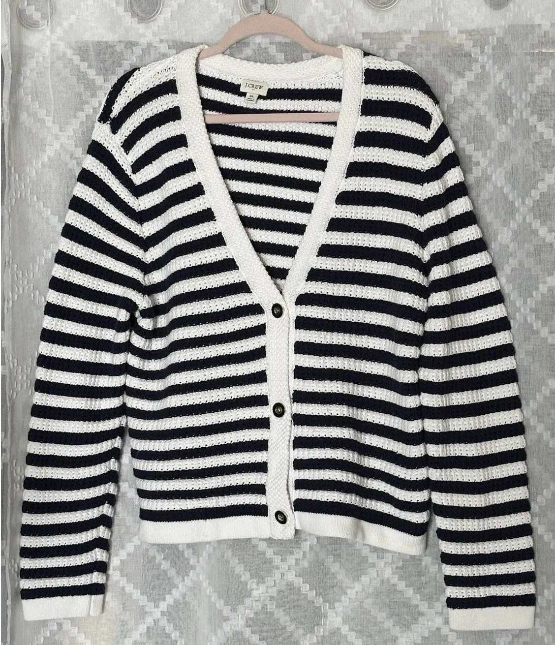 Women's J.Crew V-neck sweater in a timeless black and white stripe. Soft, comfortable knit with a relaxed fit — an easy everyday staple with classic preppy appeal. Perfect for: • work or school outfits • casual everyday wear • layering over tees or collared shirts • effortless, timeless style Clean, versatile, and always in style. Size: Women's XL (Chest measures 23 inches) Color: Black And White Style: V Neck Sweater / Classic / Preppy Condition: Great condition #Jcrew #PreppyStyle #ClassicBasics #StripedSweater #ComfortWear