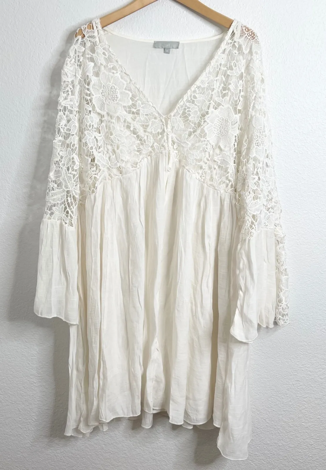 A J Gee ivory tunic dress crafted with intricate lace detailing. This charming piece features a flattering V-neckline with a subtle button detail and elegant bell sleeves adorned with delicate lace. The relaxed fit and lightweight feel make it perfect for a casual day out or a beach vacation. Size 3XL Approximate measurements follow Chest- 24" Length- 42" Great preowned condition Keywords: Joie, tunic, lace, embroidered, bell sleeve, ivory, boho, casual, beachwear, resort, feminine, lightweight, summer dress