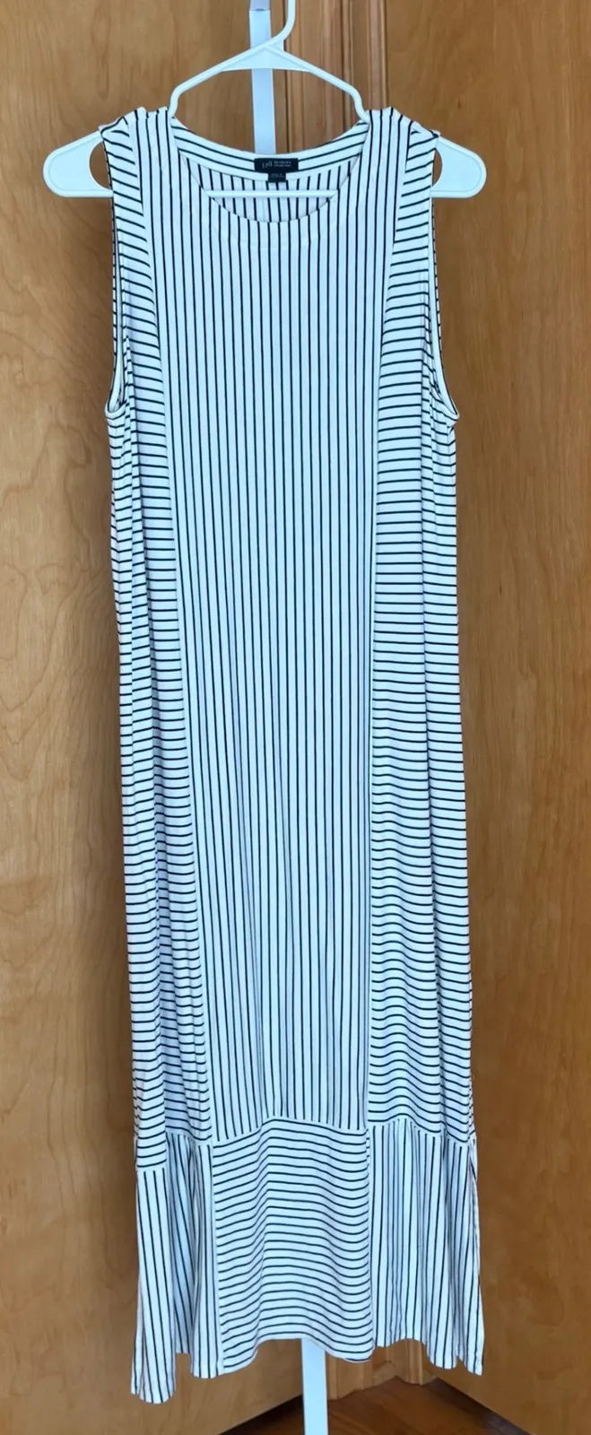 Effortless elegance defines this J Jill maxi dress, a perfect blend of comfort and chic. The captivating black and white stripe pattern creates a visually slimming effect, while the sleeveless design and relaxed fit offer freedom of movement. Its versatile silhouette transitions seamlessly from casual outings to sophisticated gatherings. Imagine wearing this to a brunch with friends or a relaxed summer evening event. Measurements: • Shoulder to shoulder: 15 in • Bust: 20 in • Waist: 21 in • Hips: 23 in • Length: 48 in Style: Maxi, Tank Dress, Sundress Dress Length: Long Department: Women Sleeve Length: Sleeveless Pattern: Striped Occasion: Casual Material: Rayon, Spandex Fabric Type: Rayon Neckline: Round Neck Season: Spring, Summer Garment Care: Machine Washable Country of Origin: Philippines Unit Type: Unit Keywords: J Jill, maxi dress, petite, sleeveless, tunic dress, stripe, black white, casual, summer, travel, comfortable, relaxed fit, day to night