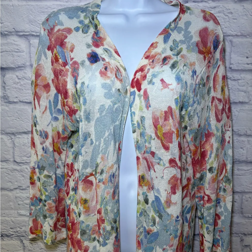 The J JILL Linen Blend Watercolor Floral Print Duster Cardigan Sweater is a vibrant and versatile pi... Show more