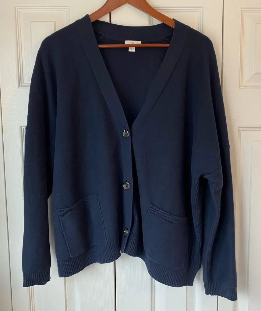 Features: Large Button Up Slouchy fit, dolman sleeve Navy blue Front pockets Condition: preloved, good condition Some pilling shown in photos Please view all pictures before purchasing. Color from picture may bath slightly due to differences in lighting Measurements approx: In photos Due to slouchy sleeves, there is one picture of sleeve starting at the seam and another measurement started closer to shoulder height Keywords: Oversize, slouchy, cozy, academia A30 15 oz