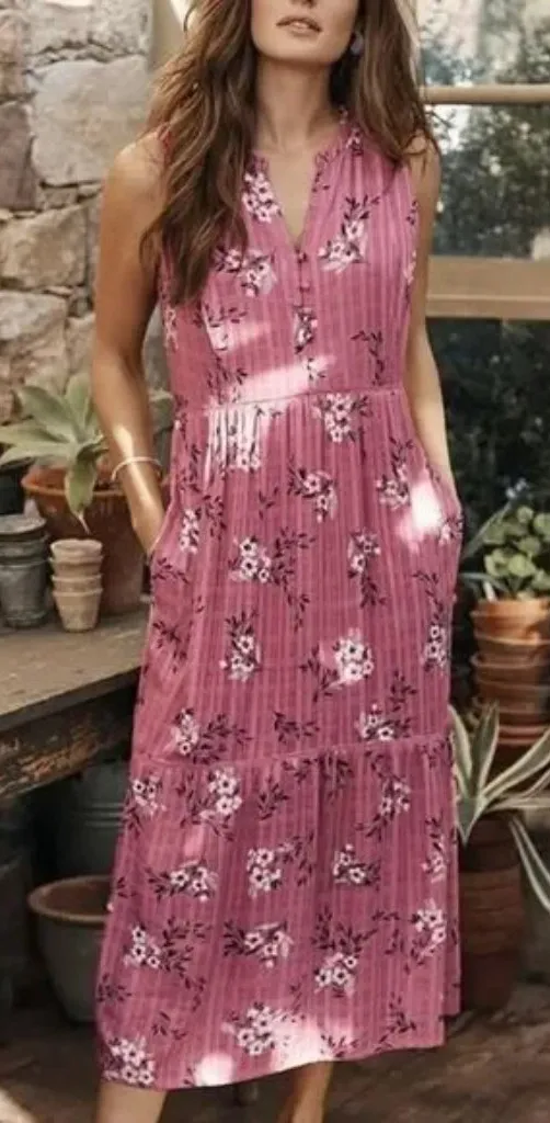Chic pink maxi dress with floral design. Sleeveless and stylish. Ideal for any event. Partially lined, Has Pockets, crinkle Textured. Tags - boho, cottage, coastal grandma, resortwear, fairy, floral, girly style, preppy fashion, hippie, western vibe, European, Quiet luxury, granola girl aesthetic, prairiecore, lagenlook, crunchy mom, sustainable, academic, fall, distressed, layered look, vintage-inspired, Y2K fashion, bohemian style, outdoor activities, nature-inspired, minimalist, unassuming. Church, summer, destination wedding, modest, event, graduation, travel, holiday, feminine, Christmas, grandma, bohemian, granola, resortwear, party, birthday, date night, boho, cottagecore, floral, tropical vacation, resort, flowy, casual, office, professional, Valentine's day, etc. BRAND: J. Jill SIZE: Medium CONDITION: Excellent condition EUC FABRIC CONTENT: 100% rayon APPROXIMATE MEASUREMENTS: 21" pit to pit, 49" length *All items come from a smoke free and pet free home.