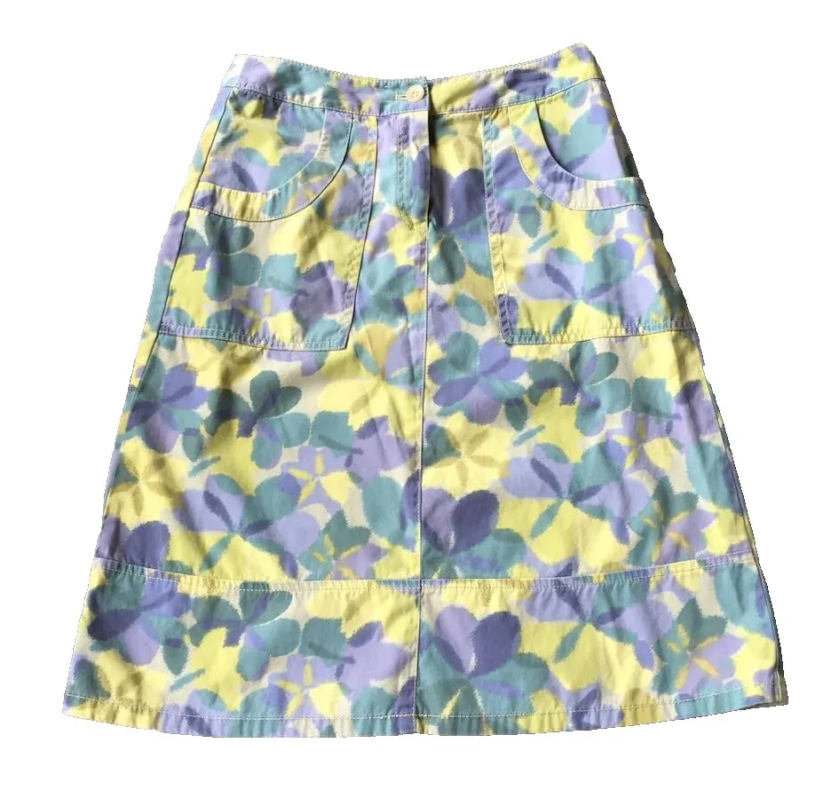 J Jill Skirt Womens 2P PXS Floral Print A Line Midi 100% Cotton Casual Chino Condition - pre-owned condition - no stains, holes or other issues noted. Please see all photos as they are part of the description. Brand: J Jill Petite Women's Size: 2P / PXS Color: Purple, Green and Yellow Stonewashed Cotton Zip Fly with Button Waist Closure Double Patch Pockets on Front and Back A Line 100% Cotton Machine Wash Made in China Measurements - are in inches, approximate & taken flat, unless otherwise noted Waist - 26" doubled Hips - 38" doubled Skirt Length - 23" top of waist to bottom hem (As all clothing will fit differently from person to person, please compare measurements given in this listing to the measurements of a good fitting clothing item you currently wear for best comparison). 8 oz