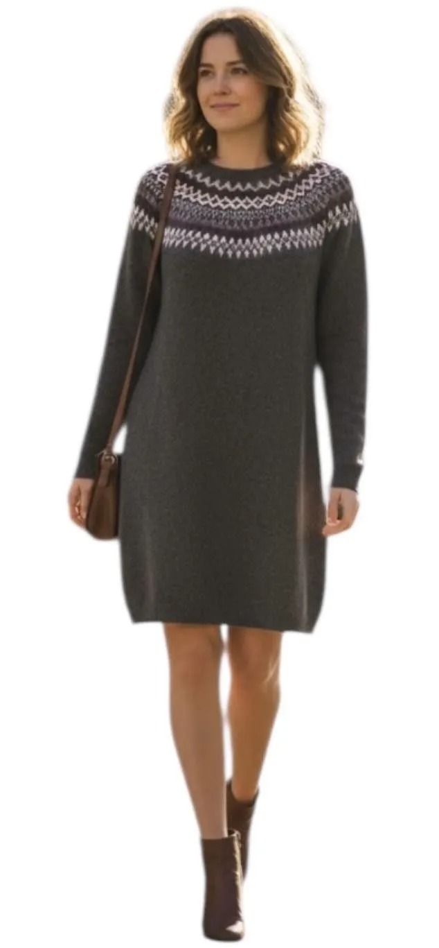 Brand: J. Jill Style: Women's long sleeve sweater dress with a classic Fair Isle patterned yoke. Color: Charcoal gray body with cream, pink, and burgundy knit pattern across the chest and shoulders. Size: Womens Medium (M) as shown on the interior size tag. Neckline and closure: Crew neck, pullover style with ribbed trim at neckline, cuffs, and hem. Fabric and materials: Soft stretch knit made from 55% cotton, 32% acrylic, 10% nylon, 1% spandex, and 2% other fibers for comfort and shape retention. Design details: Straight shift silhouette, above-the-knee short dress length, cozy medium-weight knit ideal for layering. Occasion and season: Great for casual wear or workwear in fall and winter. Additional info: Made in China; RN 97641 printed on care tag.