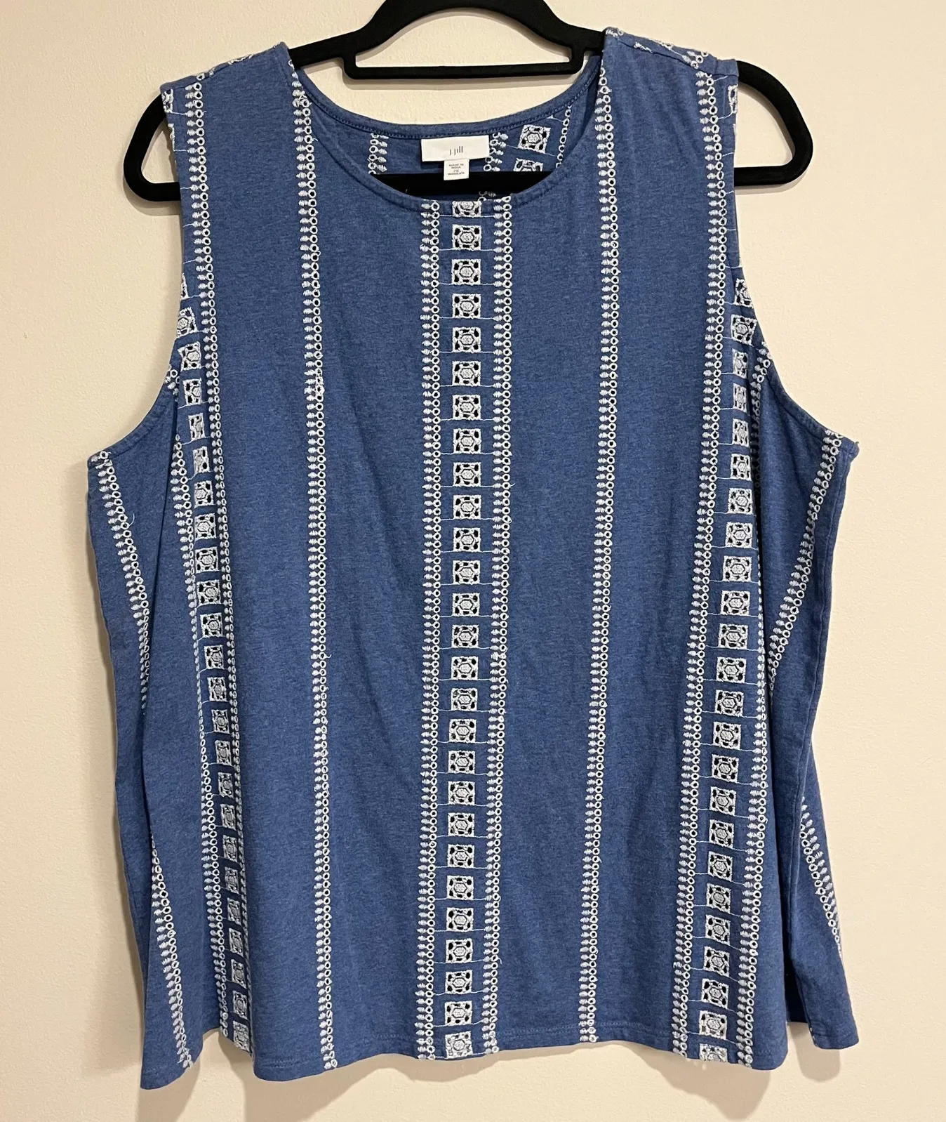 J. Jill Top Sleeveless Shirt Tank Blue White Eyelet Lace / Embroidered Detail Cute Crossover Detail on back, tacked above the slit for modesty 100% Cotton Plus Size 2X Good used condition Approximate measurements Chest: 24" Length: 26"