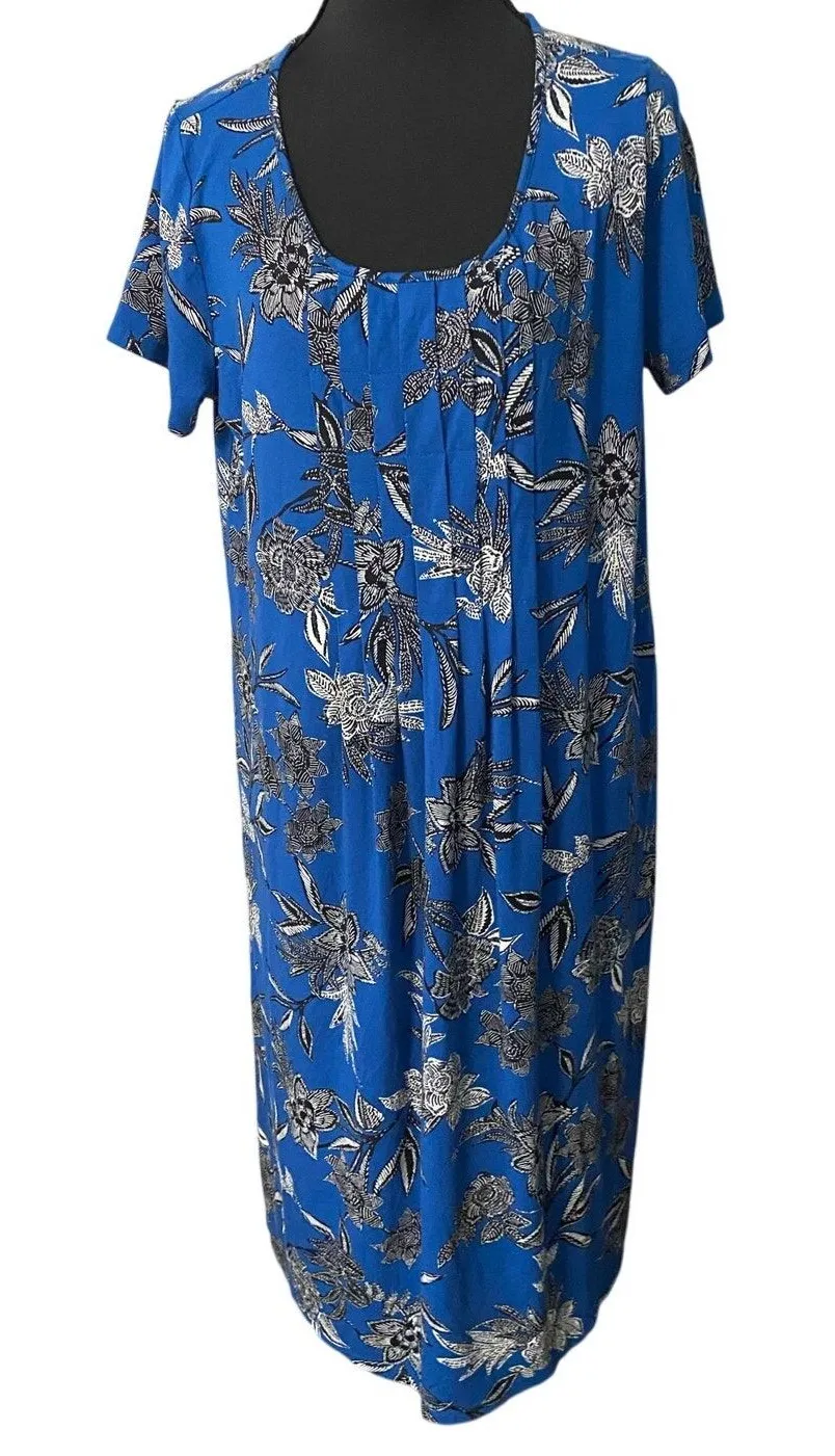 J. Jill Wearever Collection Blue Floral Midi Dress Women’s Small Short Sleeve Beautiful and easy-wear J. Jill Wearever Collection floral dress in a rich royal blue with a black-and-white botanical print. Soft stretch knit fabric with a flowy drape, short sleeves, and a scoop neckline. Front pleating adds gentle shaping without clinging. Perfect for travel, work, everyday wear, or warm-weather comfort. Pull-on style with no fasteners. Size: Women’s Small Pit to Pit: ~19" Length: ~37.5" (Measurements taken flat; approximate.) Excellent pre-owned condition. No holes, stains, or flaws noted. Smoke-free home. Fast shipper. Bundle & save on combined shipping. loungewear | minimalist | resort | cruise | cottagecore floral | casual chic | travel friendly | soft knit | summer dress