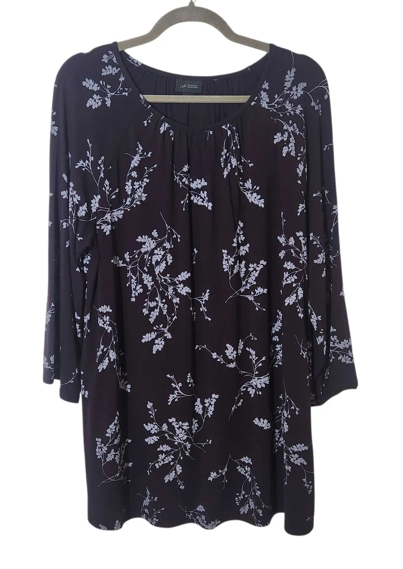 This J. Jill Wearever Collection tunic brings easygoing elegance with its rich eggplant purple shade and soft floral knit. The 3/4 sleeves and longer tunic length create that relaxed, polished flow the brand is known for, making it perfect for layering, lounging, or stepping out with effortless style. Pre-loved and in excellent condition. Style: Floral knit tunic top Color: Deep eggplant purple Special Features: Soft knit feel, 3/4 sleeves, longer tunic silhouette Condition: Pre-loved Same-day shipping for orders received on weekdays by noon CST. Measurements shown in images. 2511-33