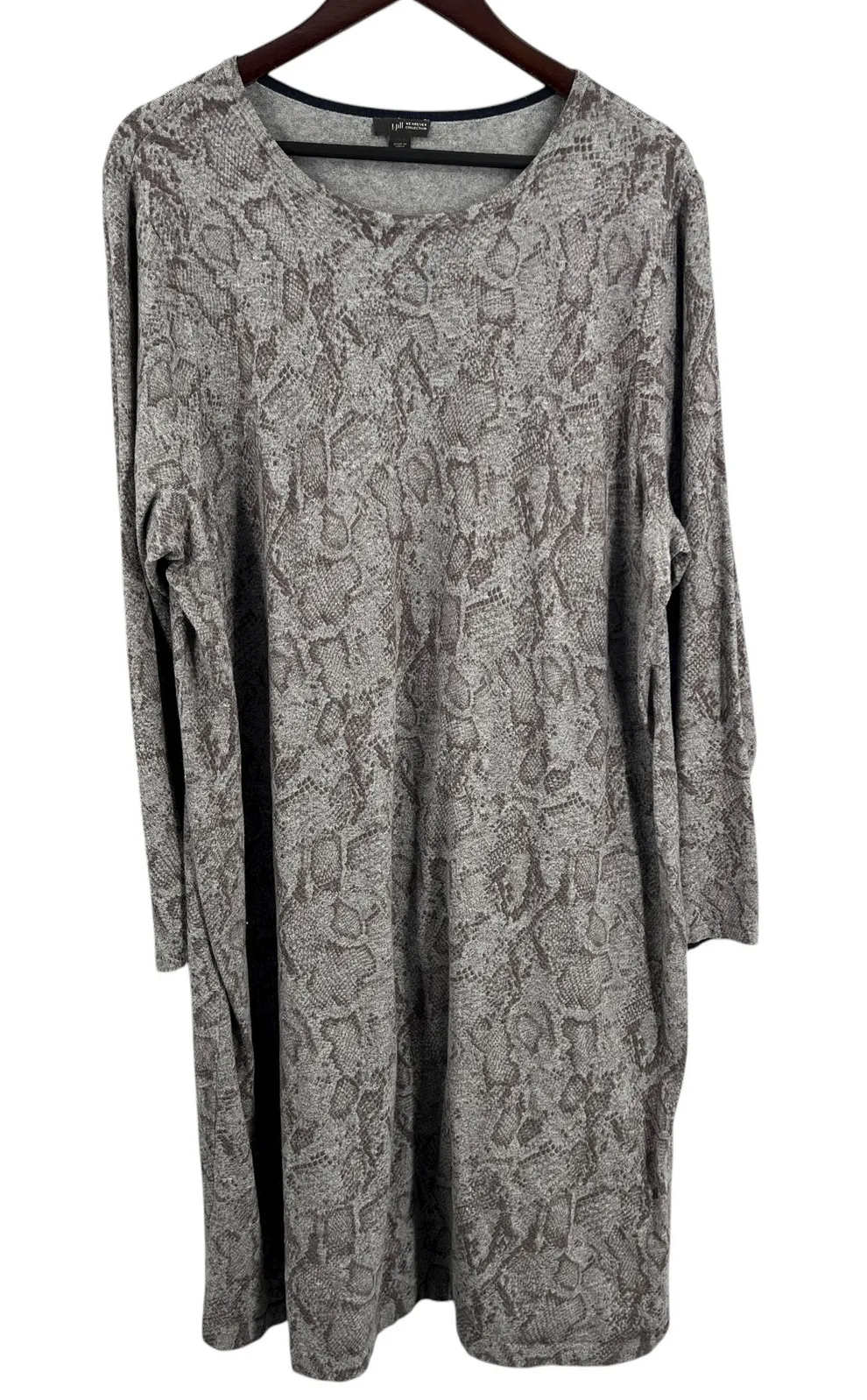 J. Jill Wearever sweater dress in a soft cotton blend knit. Subtle gray snakeskin texture, long sleeve, scoop neck. Great layered with boots or worn solo for a minimalist look. Women's size 2X with measurements: armpit to armpit 25″, waist 25.5″, sleeve length 24″, total length 40″. Excellent pre-owned condition with no visible flaws. Keywords: J Jill, Wearever Collection, Gray Dress, Snake Print, Long Sleeve, Knit Dress, Women's 2X, Plus Size Dress, Casual Dress, Pullover Dress, Comfortable Dress, Everyday Dress, Fall Fashion, Winter Dress