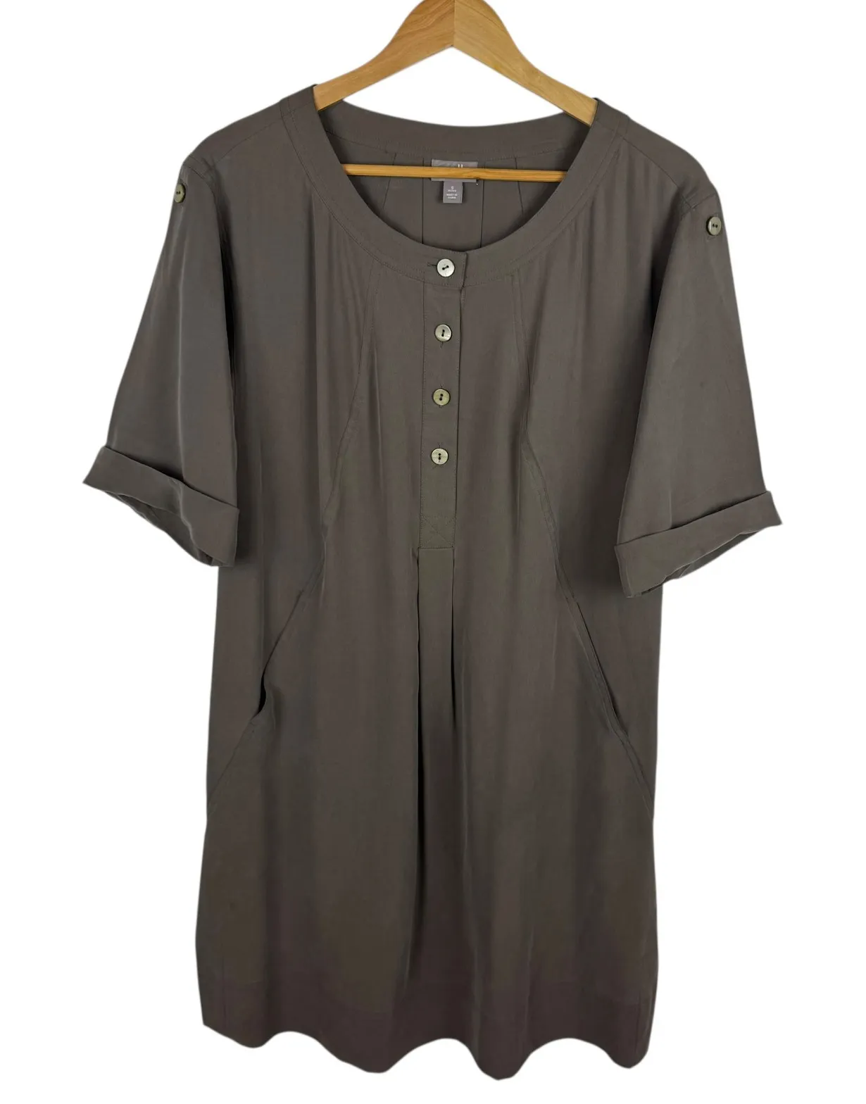 Good Pre-Owned Condition (see pics for details) Flaws: Has a couple of water spots on back from steaming (shown in photos). A sophisticated and comfortable J. Jill dress, perfect for effortless style. This dress features a button-front design, adding a touch of classic elegance, and practical pockets for convenience. The short sleeves with rolled cuffs offer a relaxed yet refined look. Crafted from luxurious silk, it drapes beautifully and feels wonderful against the skin. Ideal for a casual brunch, a day at the office, or a relaxed evening out. Style: Shirt Dress, Shift, T-Shirt Dress, A-Line Dress Length: Midi Color: Green Department: Women Pattern: Solid Occasion: Casual, Workwear, Business Sleeve Length: Short Sleeve Material: Silk Neckline: Round Neck Fabric Type: Woven Season: Spring, Summer, Fall Sleeve Type: Roll Tab Sleeve Closure: Button Keywords: J. Jill, silk dress, button front dress, short sleeve dress, petite dress, olive green dress, casual dress, work dress, pockets, women's dress, silk, petite size, dress, green dress, midi dress Measurements: included in photos. Please compare the measurements to something you already own for a great fit! Fast shipping: Shipped out next business day! Please let us know if you have any questions!