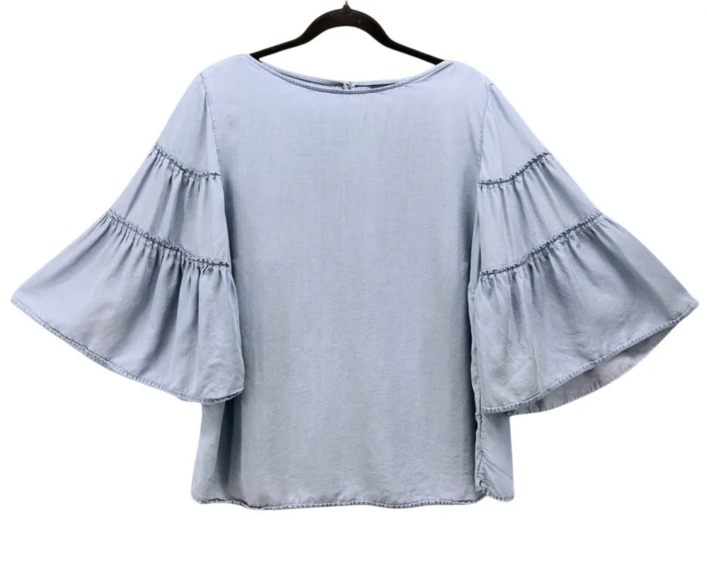 Chambray Blouse Large - J Jill Denim Womans Blouse Angel Sleeve - 100% Tencel A breath of fresh air, this light blue denim blouse offers a unique twist on a classic silhouette. The standout feature is undoubtedly the tiered bell sleeves, creating a dramatic and eye-catching effect. The lightweight fabric drapes beautifully, ensuring both comfort and style. Note a small repair by the shoulder. Please see picture Measurements: Pit to Pit: 22 Length: 26 Thank you for checking my item. If you have any questions before and after purchase, please contact me first. Items came from smoke free, dog friendly home Please check measurement before buying. Measurements are also on photo. My handling time is 1 business day. Bundle and save Have a great day!!!!!If the item is used, it was washed and I used a fabric softener which is either fresh scent, lemon, or lavender scent. If its new, I used Dryel.