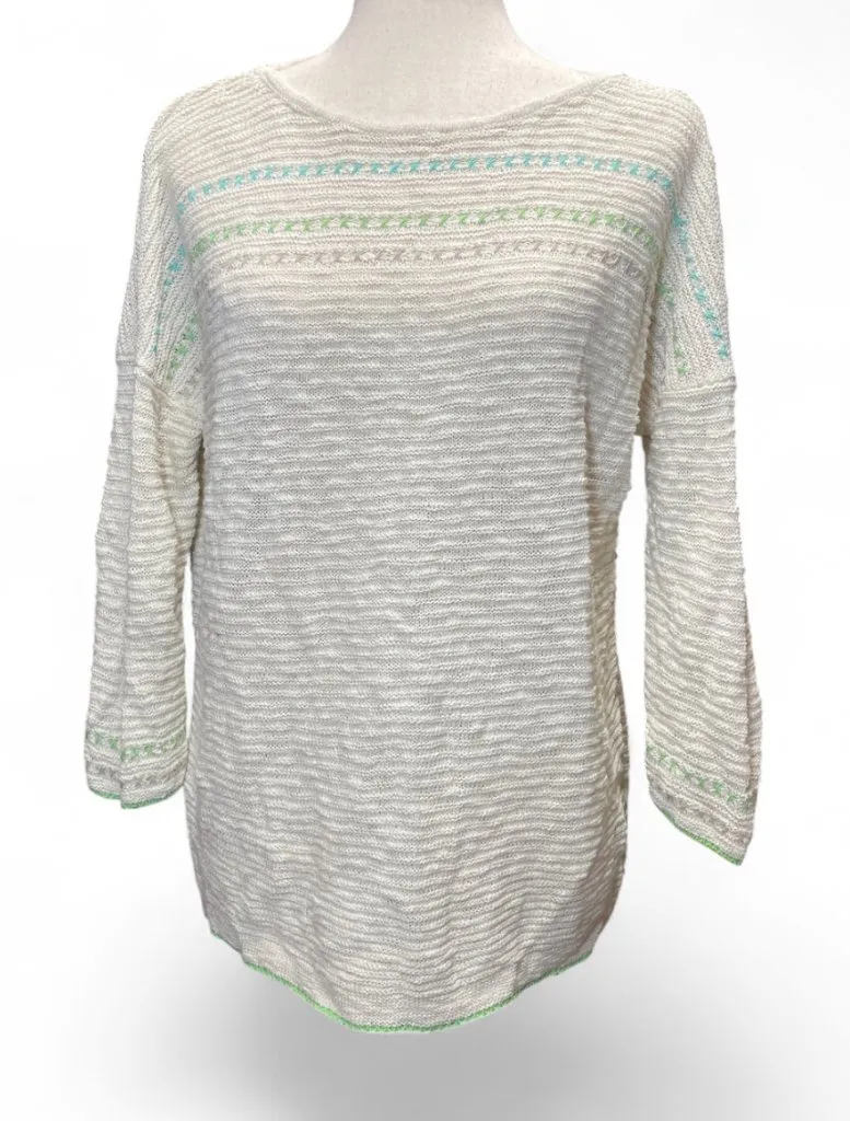 - medium - semi open knit - light green and light blue cross hatch embroidery at the neckline, hem and sleeves - slouchy - 3/4 sleeve Flat lay measurements (approximately in inches): - length: 25" - pit to pit: 22" Excellent preloved condition, no noticeable flaws. See photos for details and condition. Exact item pictured will be shipped. coastal grandma, grandma sweater, slouchy, relaxed, boho, beachy, travel, resortwear, office, casual