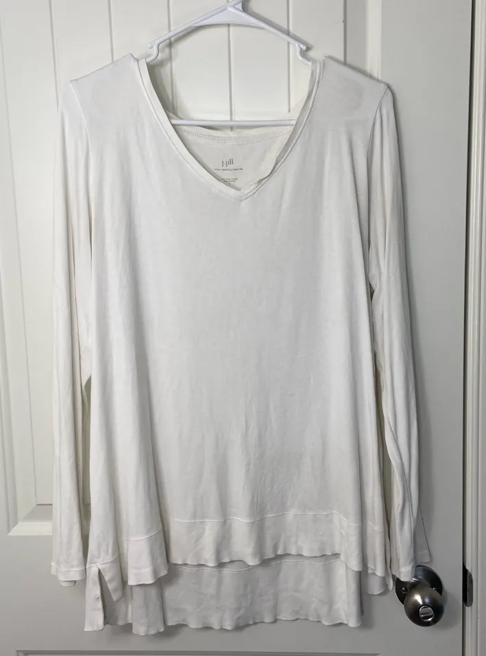 J. Jill women’s white Pima cotton v-neck long sleeve tee shirt casual stretch Size large In good used condition *has a few teeny tiny holes as shown Smoke free home! All items are lint rolled before shipping :) Pit to pit 21.5 inches, length from shoulder 26 inches