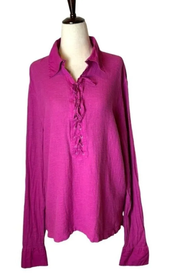 This J Lindeberg women's XL shirt features a chic pink textured cotton design. The collared lace-up front top adds a sophisticated touch, perfect for any occasion. Features: • Collared Neckline • Lace-Up Front Closure • Long Bell Sleeves With Button Cuffs • Straight Hemline • Exposed Seaming • spring, fall, winter, summer • solid • machine washable • 100% Cotton Measurements: armpit to armpit 21.5 in length 27 in sleeve 28 in Condition: Pre-Owned Excellent designer, luxury, knit, colorful, bright, cotton, 100% cotton, collared, soft, lagenlook, lace up, lace-up, casual, classic, edgy, urban, streetwear, hipster, mod, modern, classy, retro, Casual, Classic, comfy, cozy, stretch, comfortable, comfort, workwear, business, professional, sophisticated, mature, trendy, stylish, all seasons, relaxed, Designer, Size 16, Size 18, Womens, Women's, minimal, minimalist, classic, simple, basic, barbie, barbiecore, preppy,
