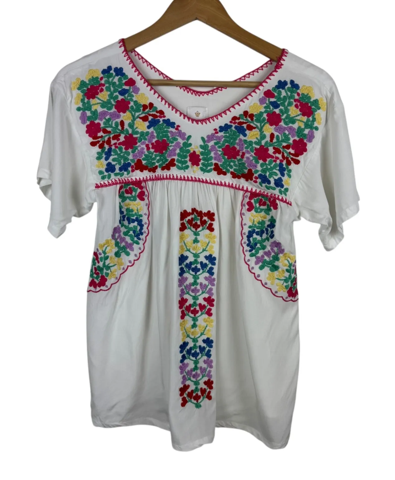 Great Pre-Owned Condition (see pics for details) Flaws: No visible flaws. Measurements: included in photos. Please compare the measurements to something you already own for a great fit! Fast shipping: Shipped out next business day! Please let us know if you have any questions! Capture the essence of bohemian charm with this delightful embroidered peasant top. A vibrant tapestry of floral embroidery dances across the crisp white fabric, creating a visually stunning and cheerful design. The colorful blooms in shades of red, blue, green, yellow, and purple add a playful touch, while the delicate pink stitching along the neckline and sleeves enhances the feminine appeal. The relaxed silhouette and lightweight rayon fabric ensure a comfortable and breezy fit, perfect for warm weather days. This top is ideal for a casual brunch with friends, a sunny afternoon at an outdoor market, or a relaxed vacation getaway. Color: White Type: Blouse Department: Women Style: Tunic Material: Rayon Neckline: V-Neck Sleeve Length: Short Sleeve Sleeve Type: Casual Sleeve Pattern: Floral Accents: Embroidered Features: Lightweight, Breathable, Relaxed Fit Fit: Relaxed Keywords: embroidered top, peasant blouse, bohemian top, floral blouse, colorful top, j. marie, rayon top, womens top, xs top, short sleeve top, summer top, festival top, vacation top 3247 B21