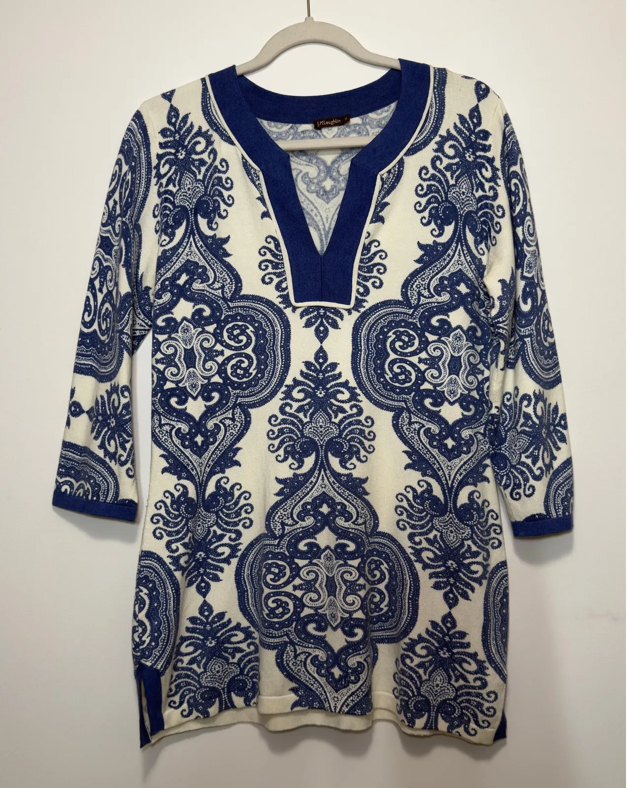 Elevate your wardrobe with this beautiful J. McLaughlin top! Featuring a sophisticated blue and white paisley pattern, this women's top is a size medium and in excellent condition. The fabric is a luxurious blend of cotton and modal, offering both comfort and style. Perfect for any occasion, this top will surely become a favorite in your closet. Don't miss out on the chance to own this classy piece!