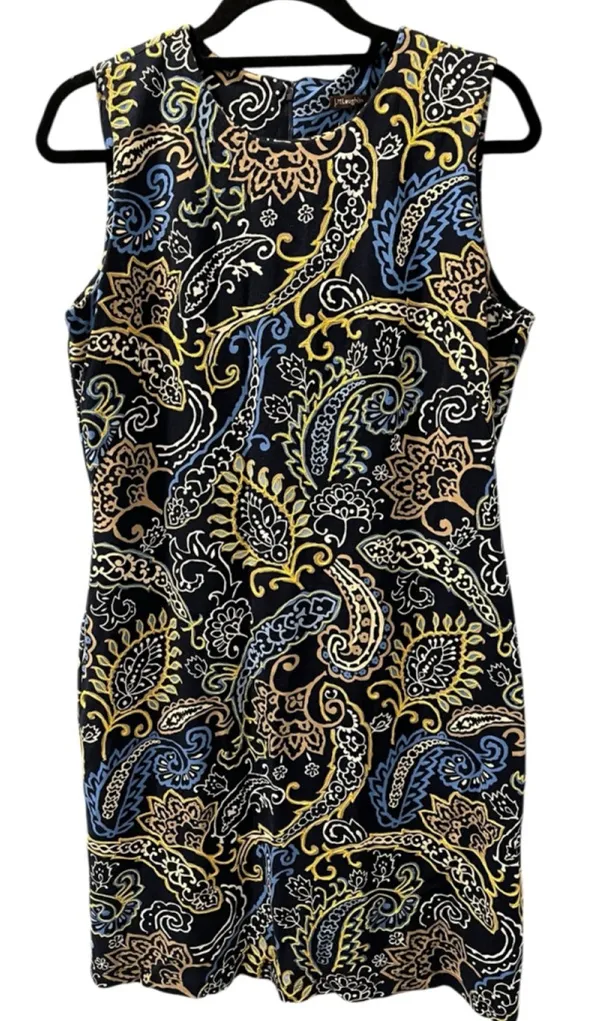 Measurements: Chest: 20" with stretch Length: 37.5" Materials: Rayon, Nylon, Spandex This J.McLaughlin sleeveless dress in size L features a black background adorned with a vibrant paisley pattern. The intricate design incorporates shades of yellow, blue, white, and light brown, some elements appearing to have a slightly raised, embroidered texture. It has a round neckline and a concealed zipper closure at the back. - Embroidered paisley design - Sleeveless style - Sheath silhouette - Size large - Breathable fabric #Fashion #SummerStyle #JMcLaughlin #FloralDress #Elegance