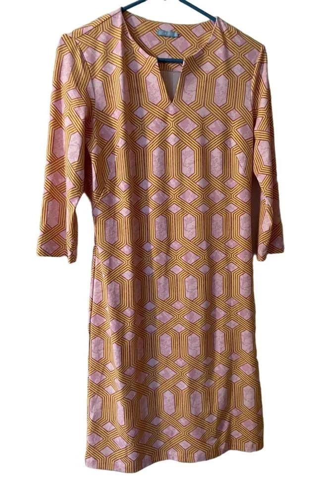 Elevate your fashion game with this J. McLaughlin mini sheath dress in a stunning pink and yellow geometric print. The high neckline and 3/4 sleeves give it a sophisticated touch that makes it perfect for any occasion, be it travel, party/cocktail, casual, workwear or business. The dress is made of nylon knit fabric that feels soft and comfortable against your skin. In addition to the stylish pattern, this dress also features a short length that shows off your legs, making it ideal for summer and spring. The dress is available in size S and belongs to the regular size type for women. Its brand, J. McLaughlin, is known for its quality products, and this dress is no exception. It is perfect for any woman who wants to look chic and fashionable in a dress that is both comfortable and versatile. Bust measured flat 16" Waist 14" Length 38" EUC P-20