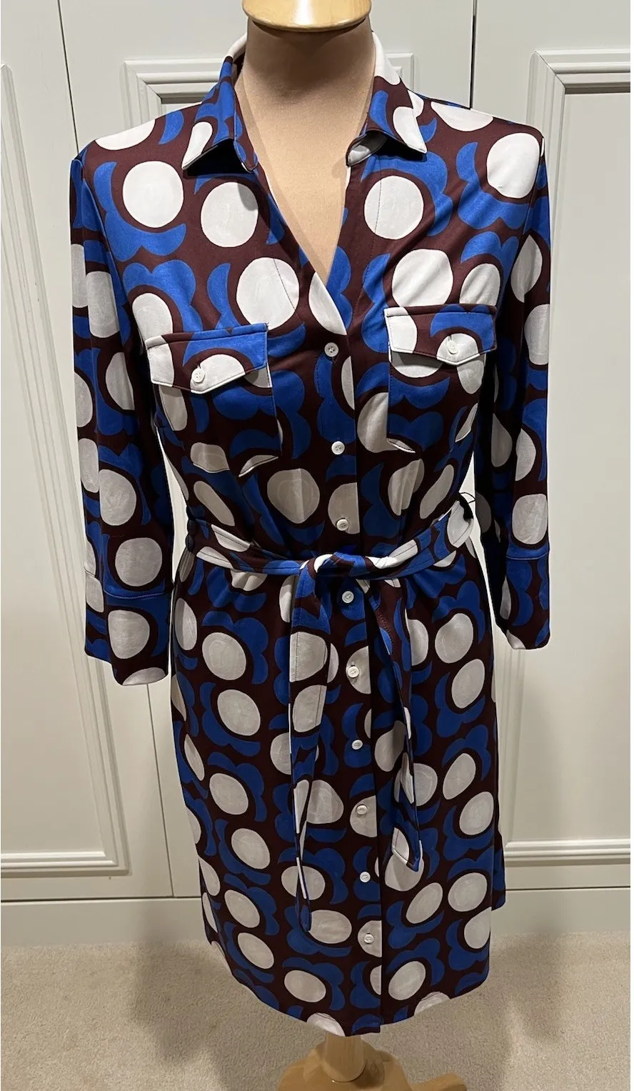 J McLaughlin Button Up Belted Shirt Dress Geometric Retro Stretch Preppy Artsy Blue Size M - $45 - From Jennifer