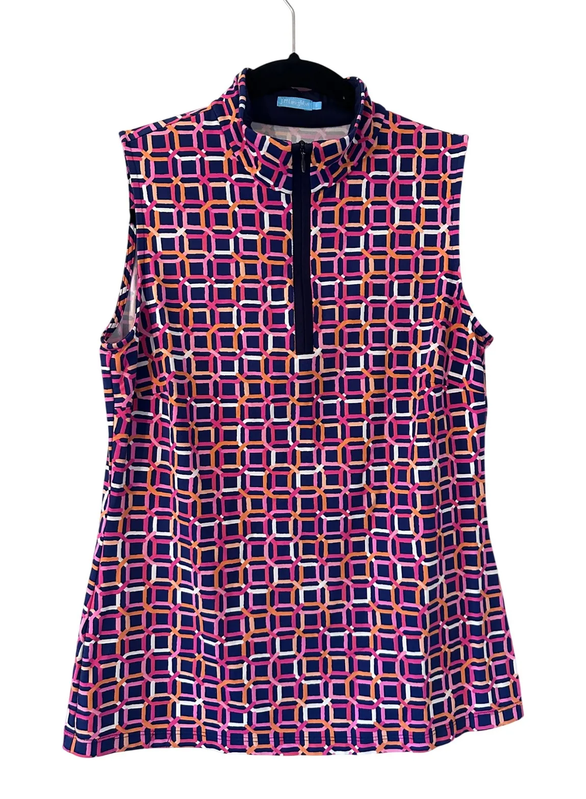 A J. McLaughlin sleeveless polo shirt in size small, boasting a vibrant geometric print. This stylish top features a mock neck and a convenient quarter-zip closure, perfect for a polished look. Its design makes it ideal for a day on the golf course or a casual outing. No stains or holes. Type: Polo Department: Women Sleeve Length: Sleeveless Features: Moisture Wicking, Breathable, All Seasons Performance/Activity: Golf Pattern: Geometric Neckline: Mock Neck Material: Polyamide, Spandex Style: Basic Fit: Regular Closure: Zip Model: J.McLaughlin Fabric Type: Knit Accents: Zipper Season: Summer Keywords: J McLaughlin, sleeveless polo, mock neck, golf shirt, athletic wear, geometric pattern, quarter zip, sporty, preppy, resort wear, activewear
