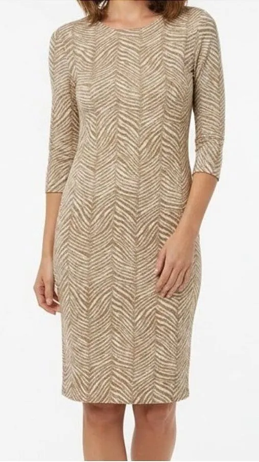 J McLaughlin in tan and white herringbone style print, signature catalina cloth, zip back, size xs. Measurements: • Length: 36 in • Waist: 15.5 in Good Pre-Owned Condition *any flaws will be noted above* ***Please make reasonable offers with the "offer" button (I won't negotiate in comments, no transactions offsite, no trades)**** • All items come from a smoke-free home. • Please compare the measurements to something you already own. Keywords: J McLaughlin, sheath dress, tan dress, white dress, three quarter sleeve, women's dress, sophisticated, statement dress, professional dress, career, office