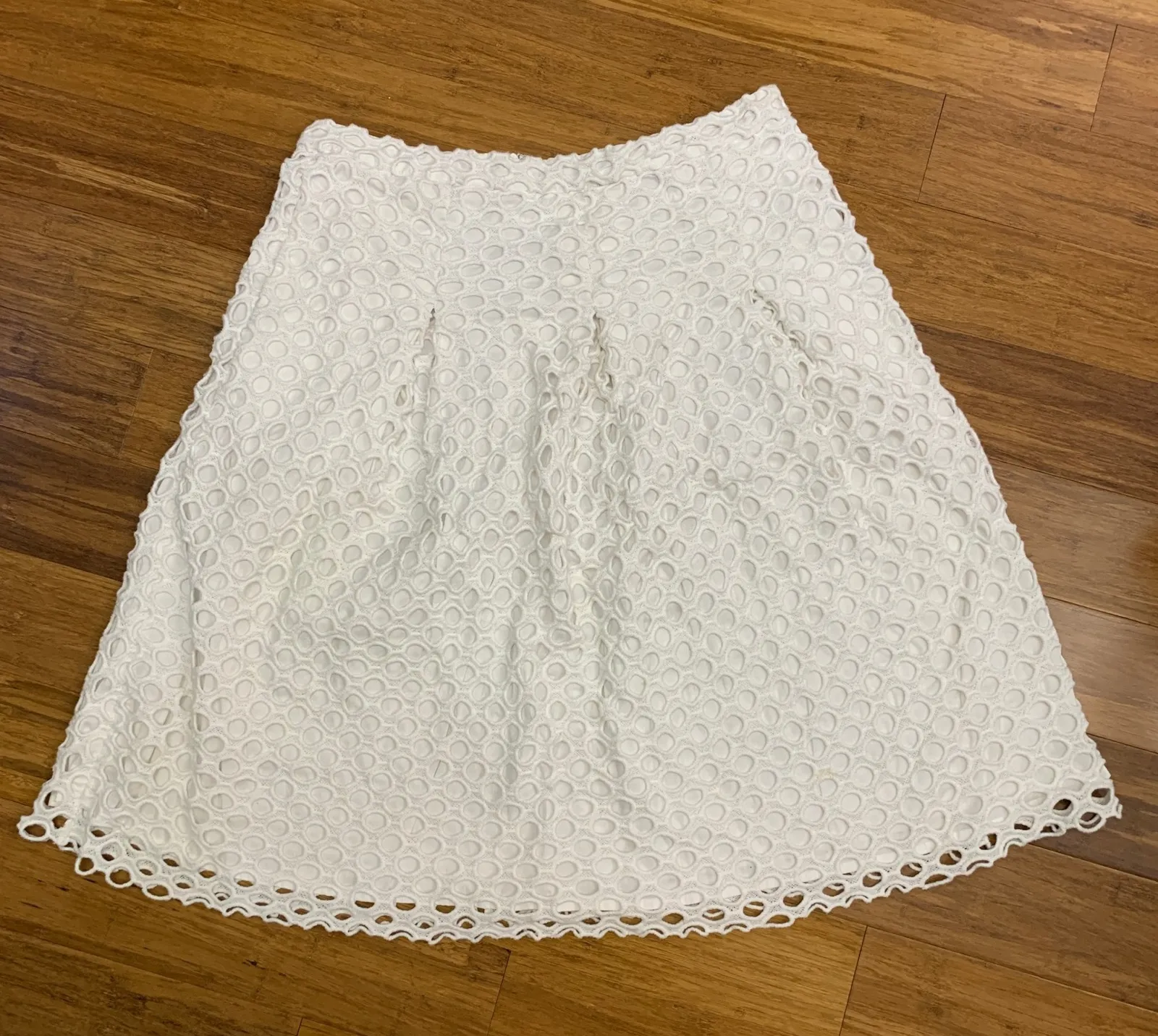 A charming white eyelet midi skirt. This skirt features a flattering A-line silhouette with subtle pleating at the waist, creating a graceful flow. The intricate eyelet pattern adds a delicate texture, while the convenient side pockets offer practicality without compromising the design. Designed with a comfortable lining, this skirt is a versatile addition to any wardrobe. Keywords: J McLaughlin skirt, white eyelet skirt, midi skirt, A-line skirt, pleated skirt, cotton skirt, summer skirt, lined skirt, skirt with pockets, womens skirt, size 14 skirt, designer skirt, casual skirt, chic skirt, preppy style Good used condition. Discolored spot on front as pictured. Open to offers!