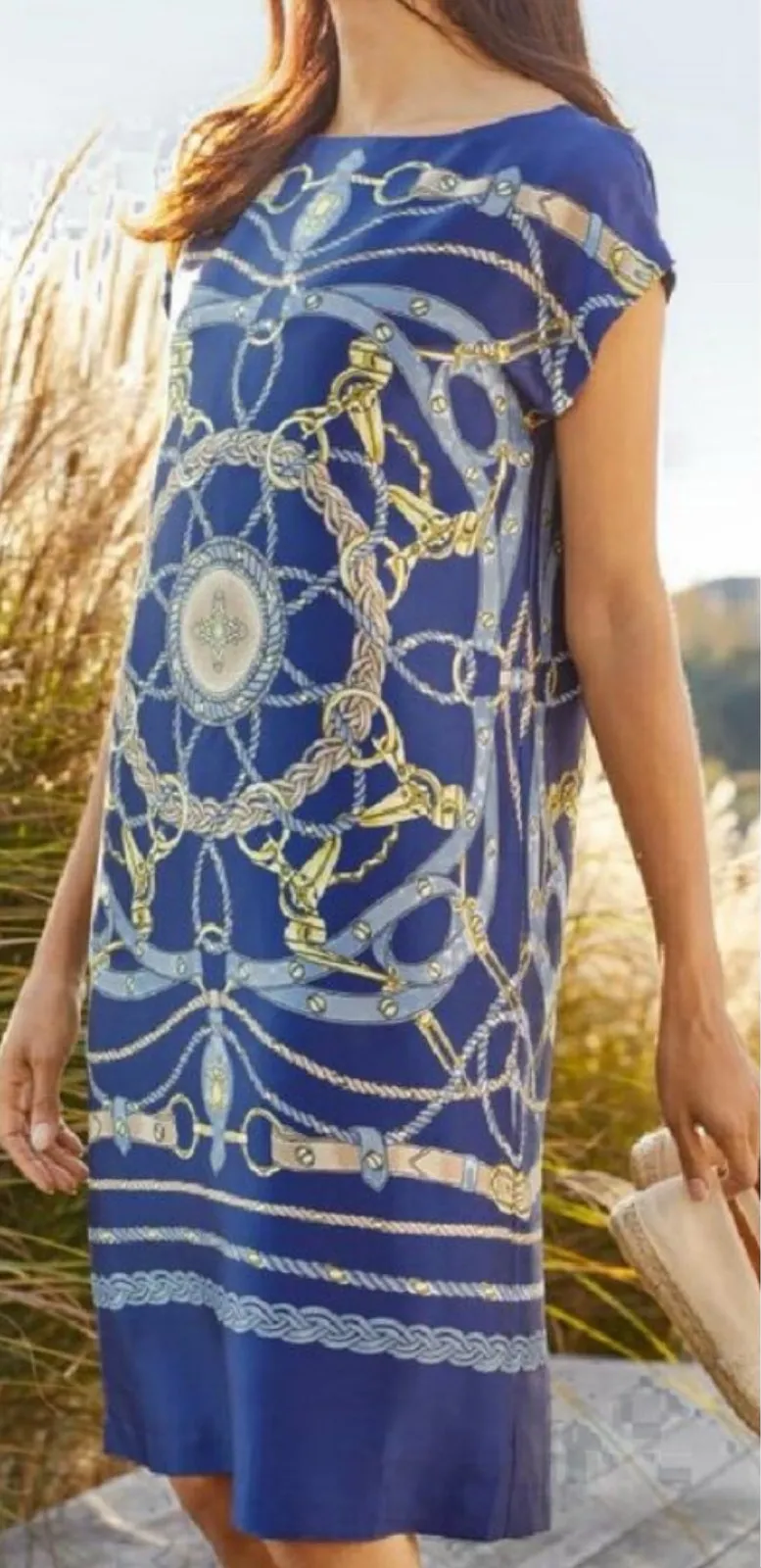 in Cornwall Equestrian Print size XS In excellent pre-owned condition The formula for a great dress starts with a bold print, cap sleeves and a chic boatneck. Althea nails this formula and was made for resorts, drinks on the patio and a sleek pair of sandals. Add an armful of bangles and head out in style. Shift silhouette Color: Cornwall Equestrian Length: just above the knee Cap sleeves Boatneck / boat neckline Pockets Lined Polyester, spandex Dry clean Measurements: 19.5in underarm to underarm 19.5in across waist 37.5in shoulder to hem resort wear, luxury, vacation, preppy