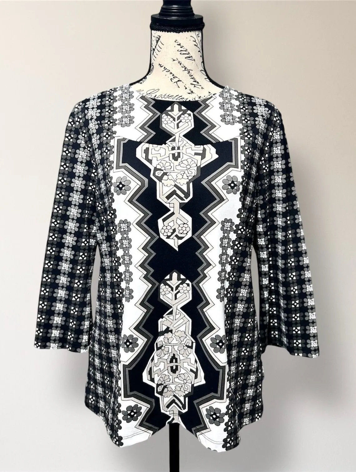 Classic J.McLaughlin Catalina top in a striking black and white geometric print with subtle floral m... Show more