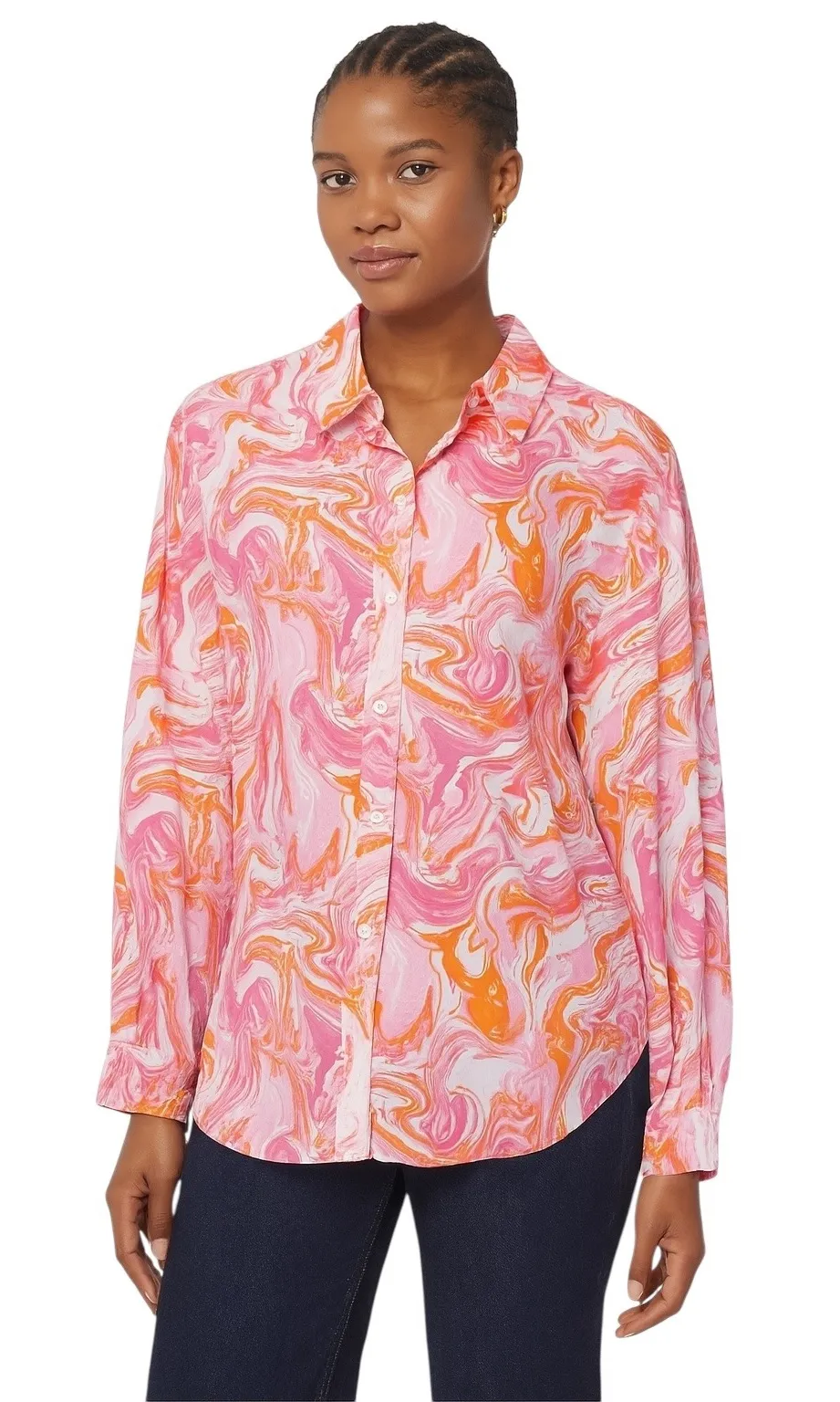 A vibrant and stylish button-up shirt, perfect for adding a pop of color to your wardrobe. This long-sleeve top features a unique swirl print in shades of pink, orange, and white, creating a visually appealing and eye-catching design. The classic button-up style offers versatility, allowing it to be worn casually or dressed up for more formal occasions. Pair it with jeans for a relaxed weekend look, or tuck it into a skirt for a chic office ensemble. This shirt is also ideal for brunch dates or garden parties. Chest: 21" across Length: 26" Color: Pink Type: Button-Up Department: Women Style: Basic Material: Cotton Neckline: Collared Sleeve Length: Long Sleeve Sleeve Type: Classic/Fitted Sleeve Accents: Button Pattern: Swirl Features: All Seasons, Easy Care Fit: Regular Keywords: J.McLaughlin, button-up shirt, long sleeve top, swirl print, pink shirt, orange shirt, cotton shirt, womens shirt, casual shirt, dress shirt, medium shirt, designer shirt, statement shirt, colorful shirt, abstract print Very good, pre-owned condition! Smoke-free, pet-free. Ships within 1 to 2 business days. Save the planet. Shop second hand
