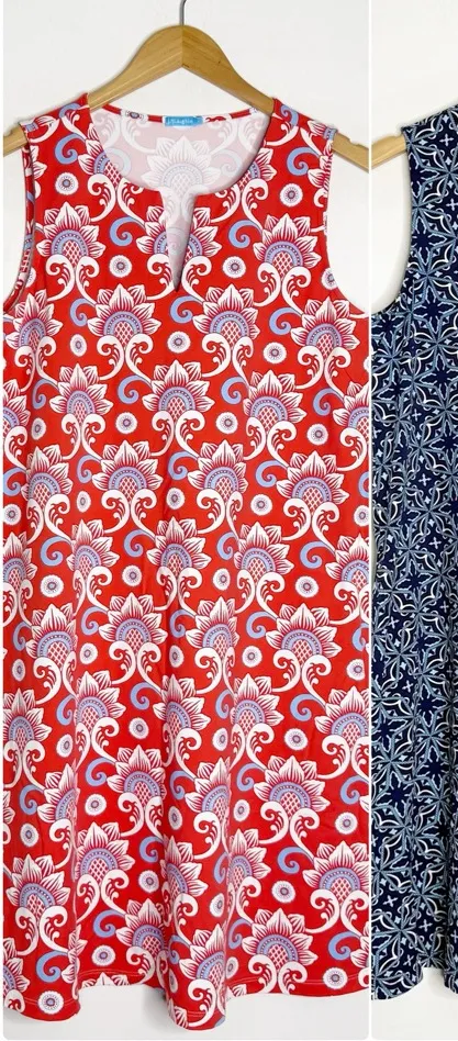 J.McLaughlin Sleeveless Dresses – Size Large – Nylon Spandex Catalina Cloth Beautifully crafted from J.McLaughlin’s signature stretchy Catalina Cloth®, these sleeveless shift dresses are effortless, lightweight, and perfect for resort wear, work, or weekends. Each features a notched neckline, tailored armholes, and bold prints that are both timeless and fun. Available Prints: 1. Coral Red Floral Scroll Print – Vibrant red with white and blue accents 2. Navy Tile Print – Geometric medallion motif in blue and white 3. Blue Line Print – Abstract navy and white herringbone design Details: • Brand: J.McLaughlin • Size: Large • Fabric: 91% Nylon / 9% Spandex • Style: Sleeveless Shift Dress / Catalina Cloth • Features: Stretchy knit fabric, easy pullover style, notched neckline • Measurements (approximate): • 19” underarm to underarm • 37” length Condition: Excellent pre-owned condition — clean, vibrant, and ready to wear.