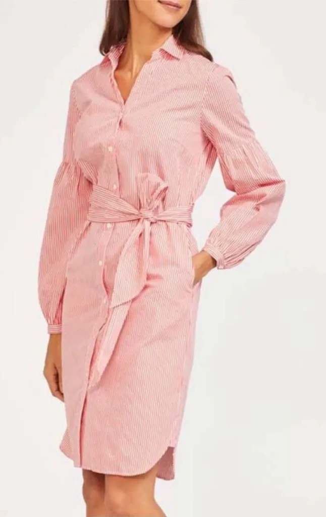 EXCELLENT CONDITION!!! BARELY WORN!!! J. MCLAUGHLIN MILLBURY DRESS SHIRT DRESS KNEE LENGTH SIDE POCKETS SLEF TIE AT WAIST GATHERED SLEEVE DETAIL CORAL RED & WHITE STRIPE 100% COTTON MACHINE WASHABLE