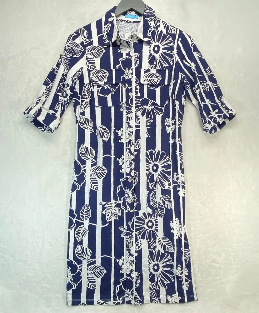 Style: Shirt Dress Dress Length: Knee Length Color: Blue Department: Women Pattern: Floral Sleeve Length: Short Sleeve Occasion: Casual, Travel, Workwear Material: Cotton Fabric Type: Woven Neckline: Collared Character: Nautical, Preppy, Resort, Classic, Botanical Season: Spring, Summer Sleeve Type: Roll Tab Sleeve Keywords: navy stripe, button down dress, floral print, collared dress, short sleeve, summer dress, casual dress, nautical, preppy style, shirt dress, white floral, navy blue, botanical print, resort wear, knee length Thank you for viewing my listing! Please see the photos for a detailed look at its CONDITION and MEASUREMENTS. All preowned items have been steam cleaned and/or washed. Feel free to reach out with any questions.