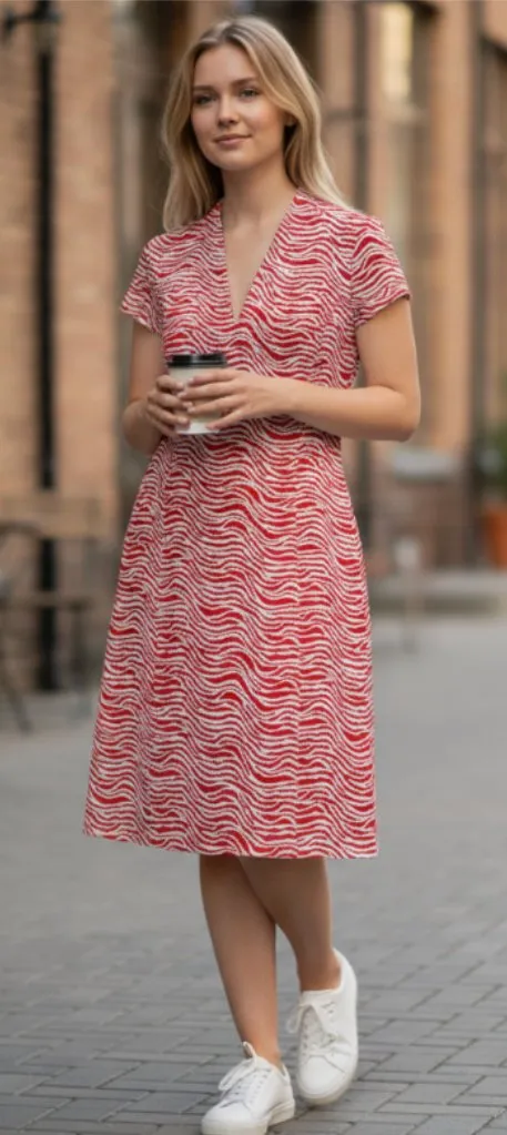 Elevate your wardrobe with this stunning J.McLaughlin wrap dress featuring a fierce zebra-inspired wavy stripe print in vibrant red and crisp white. Perfect for summer outings, office chic, or date nights, this knee-length beauty has a flattering V-neckline, short sleeves, and a flowy silhouette that moves with you. Made from lightweight, breathable fabric that’s easy to care