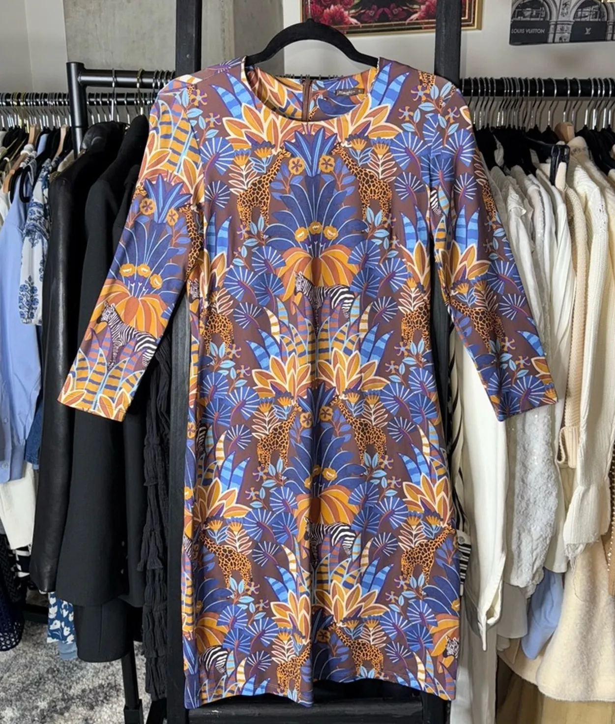 So good 🤍 Great condition. Size small. Features: Chic and colorful, this J. McLaughlin Sophia dress features a safari-inspired print with giraffes, zebras, and tropical foliage in rich brown, blue, and gold tones. Designed with a flattering sheath silhouette, crew neckline, and ¾ sleeves in a smooth stretch nylon-spandex blend. Effortless yet bold for workdays or weekends. Style Aesthetic: classic elegance, resort chic, sophisticated, vibrant print, preppy luxe, vacation style, feminine polish, effortless dressing