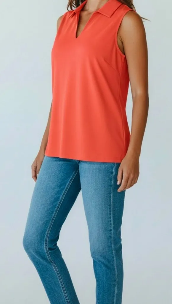 Sleeveless Split-neck top with collar Relaxed fit All over solid print Lightweight and breathable Coral pink Pullover styling Length - 26" Across chest - 20" This item is in excellent pre-owned condition without any blemishes Trusted seller; ships quickly Packaged with care Ships from a smoke-free and pet-free envionment
