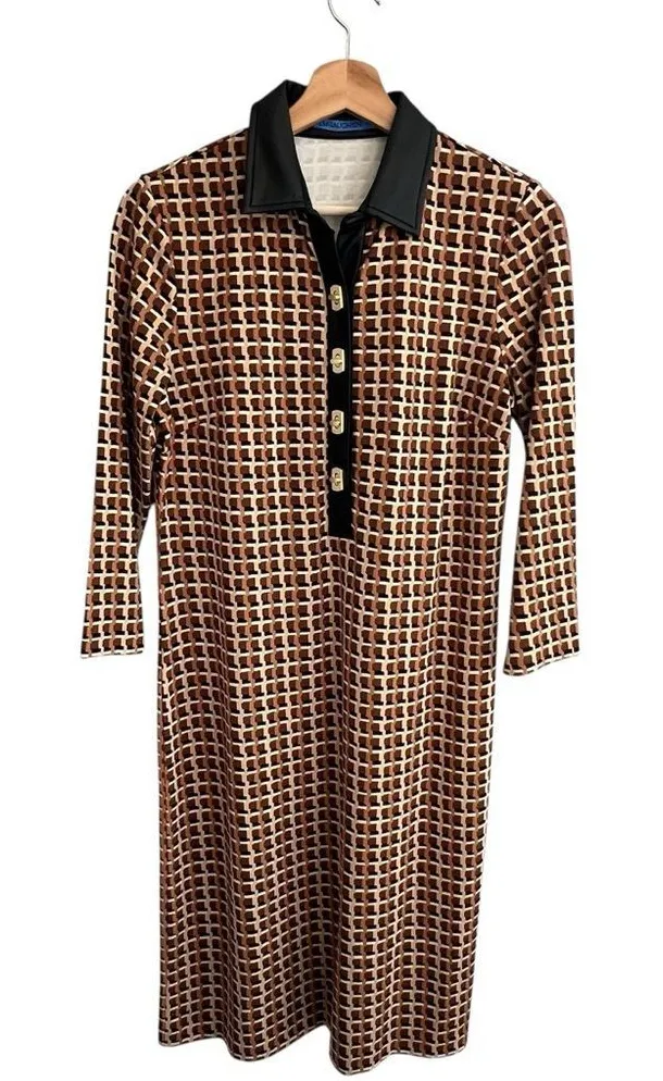 J.McLaughlin Womens Bainbridge Sheath Dress Preppy Office Country Club -Size SMALL -Excellent Preowned Condition: No holes, stains or tears. -See photos for measurements -Bainbridge woven fabric -Point collar with v-neckline -Vegan leather trim on placket and collar -3/4 sleeves -Geo print -Toggle placket closure classic, timeless, preppy, office, career, country club