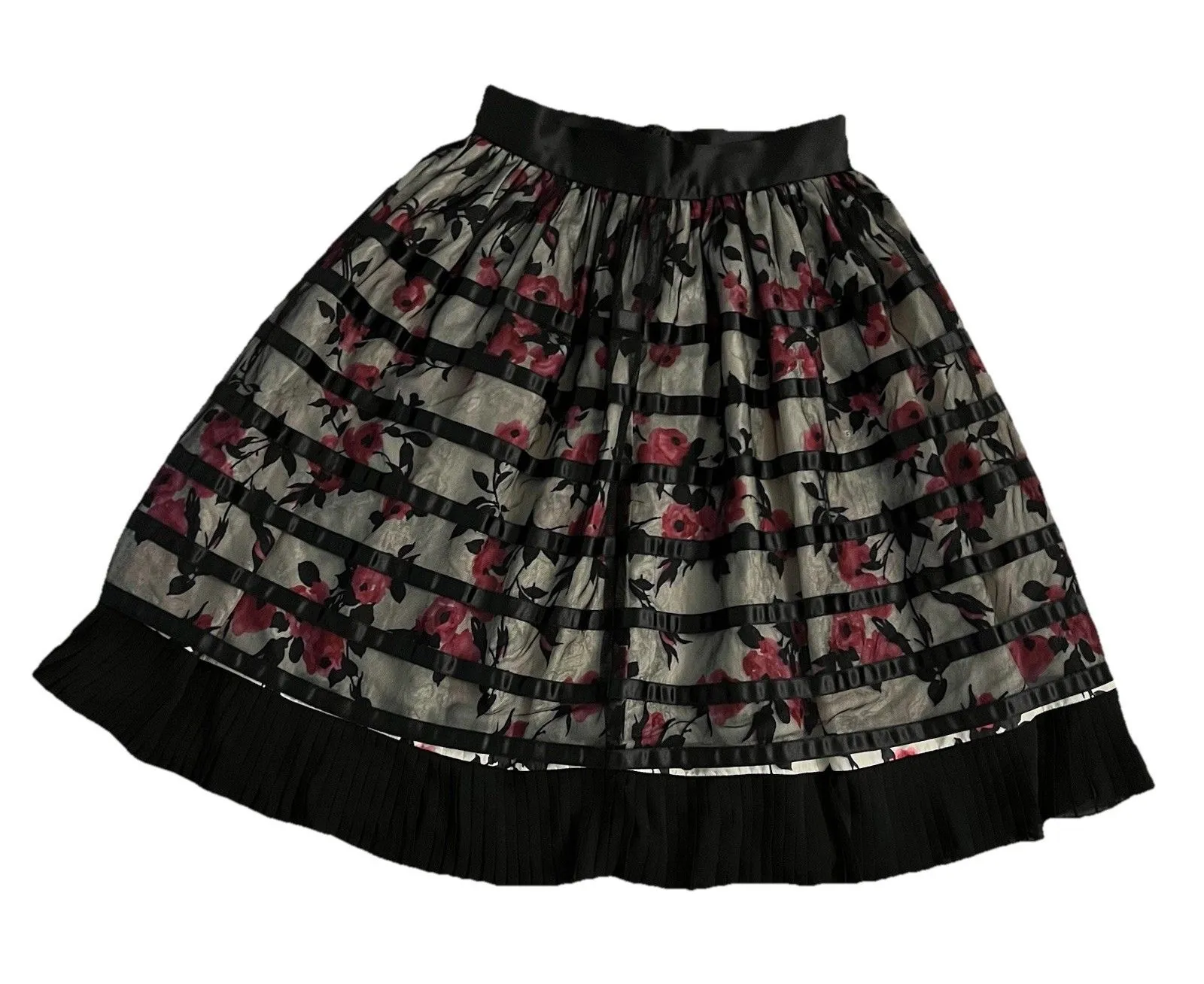 J. Perterman Floral Ribbon Skirt 6 Midi Black Pink Satin Lace Overlay Pleated - $50 - From Fiona