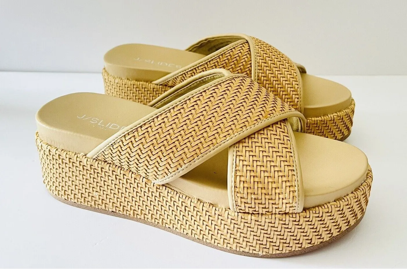 Elevate your summer style with these J/Slides Quackie Platform Vegan Chunky Sandals. The slip-on design features a solid beige color, synthetic upper material, and open toe model. The wedge heel style adds a touch of sophistication, perfect for resort wear or casual outings. The sandals come in US shoe size 9.5 and are woven with straps for added comfort and style. These J/Slides sandals are perfect for women who value both fashion and comfort. The chunky design and slip-on closure make them easy to wear, while the woven straps add a unique touch. Whether you're heading to the beach or running errands, these sandals are a must-have addition to your wardrobe.