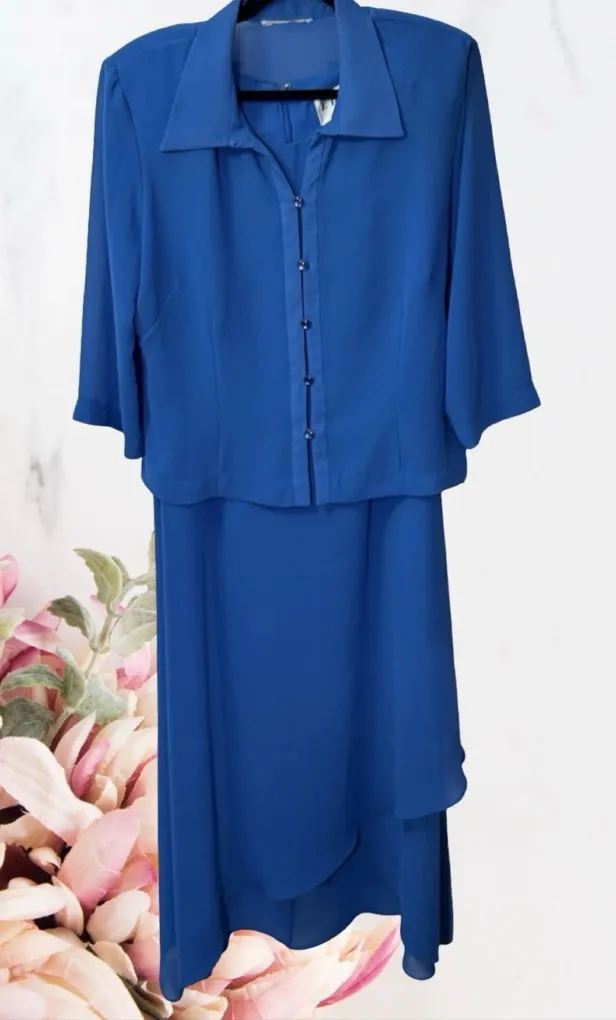 The VTG J. Taylor Dress Set is a stunning 2-piece outfit that includes an asymmetrical blue dress wi... Show more