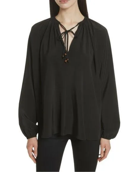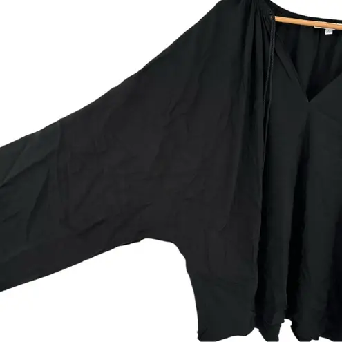 A bohemian inspired silhouette and deep neckline makes this Elizabeth and James top a staple piece for a chic finish. Black silk (100% Silk). Long dolman sleeves. V-neckline with tie detail, can be worn open or tied. Approx 27.5" from shoulder to hemline. No flaws, minimal wear.