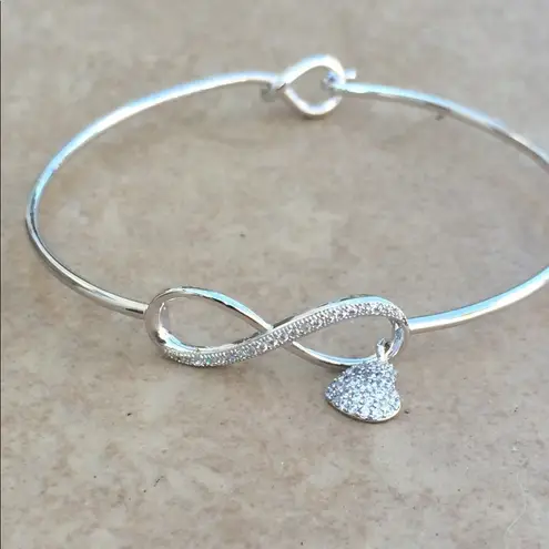 Rhodium plated bangle bracelet features an infinity symbol at the center and has a dangling heart ch... Show more