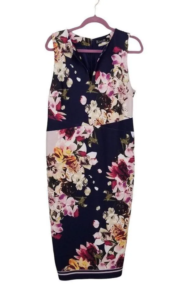 Beautiful navy & pink floral scuba sheath dress from NY&CO. Laying flat: Armpit to armpit ~16inches Waist ~15 1/2 inches Shoulder to bottom hem ~43 inches (Usually I wear L in this brand, so please check measurements if you're not sure.) smoke free home