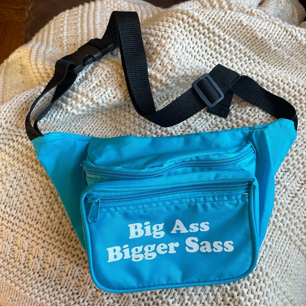 Hardly used Crave the Rave belt bag/ Fanny pack/bum bag with "Big Ass Bigger Sass" on the front. Two top/ front zippered pockets and one back zippered pocket. Black buckle strap. Price is based on the rareness of the item! Selling because unfortunately my sass doesn’t outweigh my ass. Approximate When flat across measurements are as follows: 10x6x3
