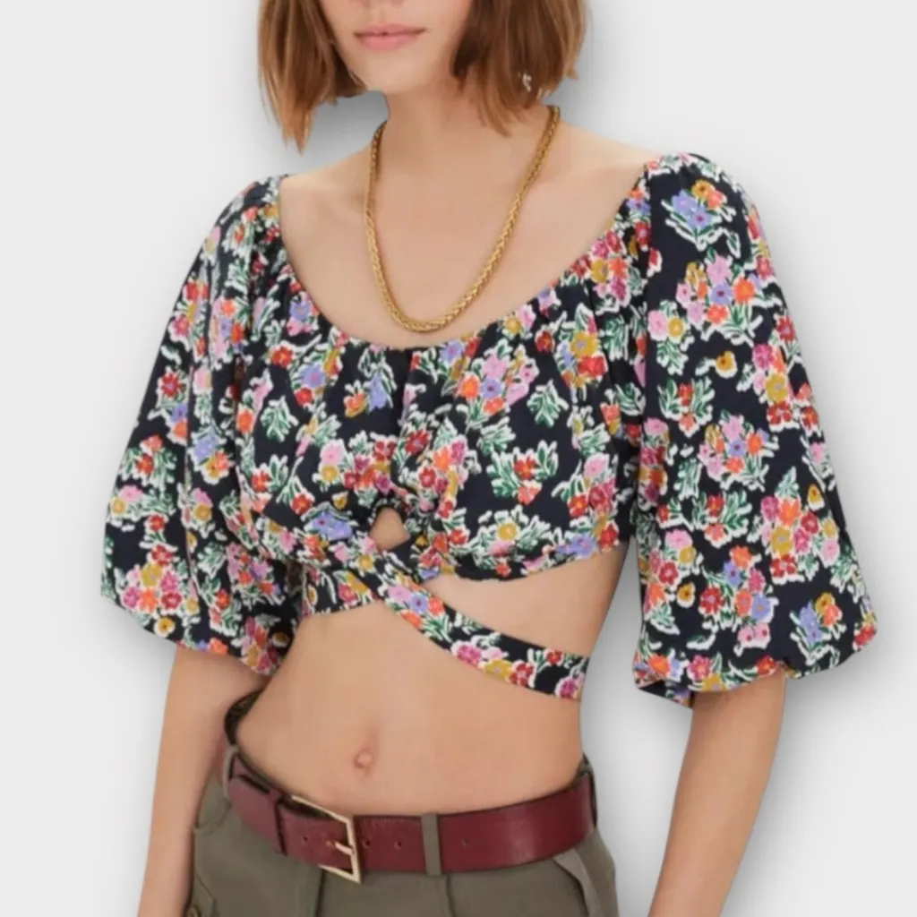 Turn heads in this For Love & Lemons floral wrap crop top — a romantic statement piece featuring a v... Show more