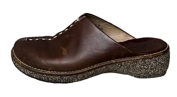 Clarks Mitchell women’s 6M brown leather clogs. Slip-on comfort mule with cushioned footbed, contras... Show more